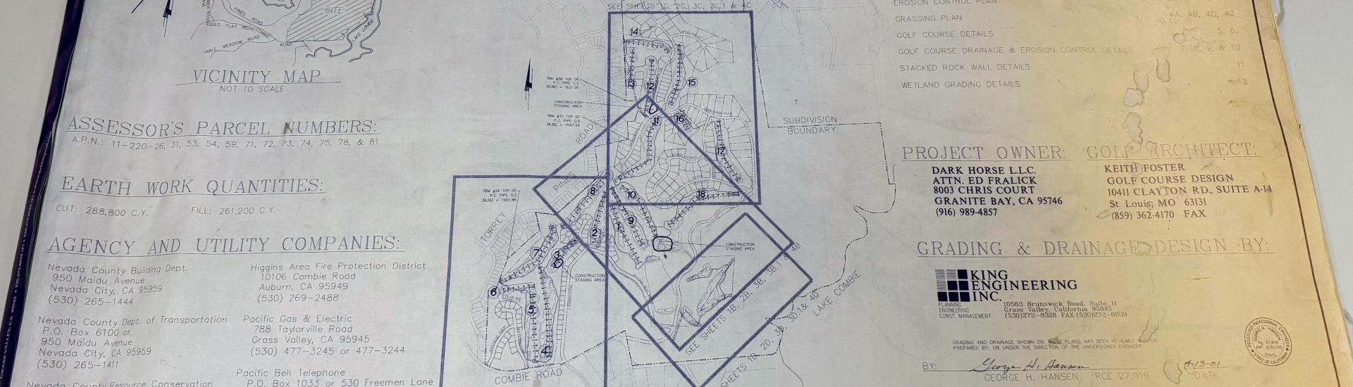 Darkhorse Golf Club is a master-planned golf and residential development located in Nevada County, California. The project was approved through a series of recorded subdivision maps, development agreements, and improvement plans that contemplated a fully integrated golf course, practice facilities, irrigation infrastructure, and supporting parcels functioning as a single, unified project.